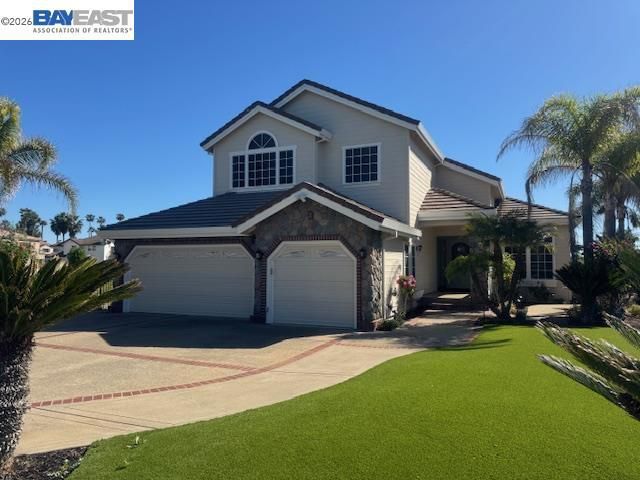 Stunning Discovery Bay Country Club custom home with sweeping water and golf course views overlooking the 1st fairway. Situated on a private corner lot, this 4BD/3.5BA residence includes a desirable ground-floor en-suite. The chef’s kitchen features stainless steel appliances, granite countertops, walk-in pantry, breakfast bar, wine fridge, and ample cabinetry. The family room offers a stone-accented gas/wood-burning fireplace and opens to the backyard for seamless indoor-outdoor living. The spacious primary suite includes a sitting area with dual-sided fireplace, spa-like bath with dual vanities, walk-in closet, and breathtaking sunrise and fairway views. The backyard is designed for entertaining with a built-in fireplace, patio seating, BBQ area, and lush landscaping. Oversized 3-car garage with custom cabinetry and workspace. Exceptional home offering luxury, comfort, and incredible views.